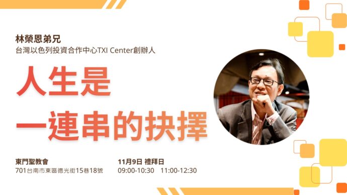 人生是一連串的抉擇 林榮恩弟兄 tmhc1968–最新消息–2025 11 月 72025 11 月 7 林榮恩弟兄 台灣以色列投資合作中心TXI Center創辦人邀請弟兄姊妹們一起來聚會喔!11月9日 禮拜日 第一堂09:00-10:30 第二堂11:00-12:30